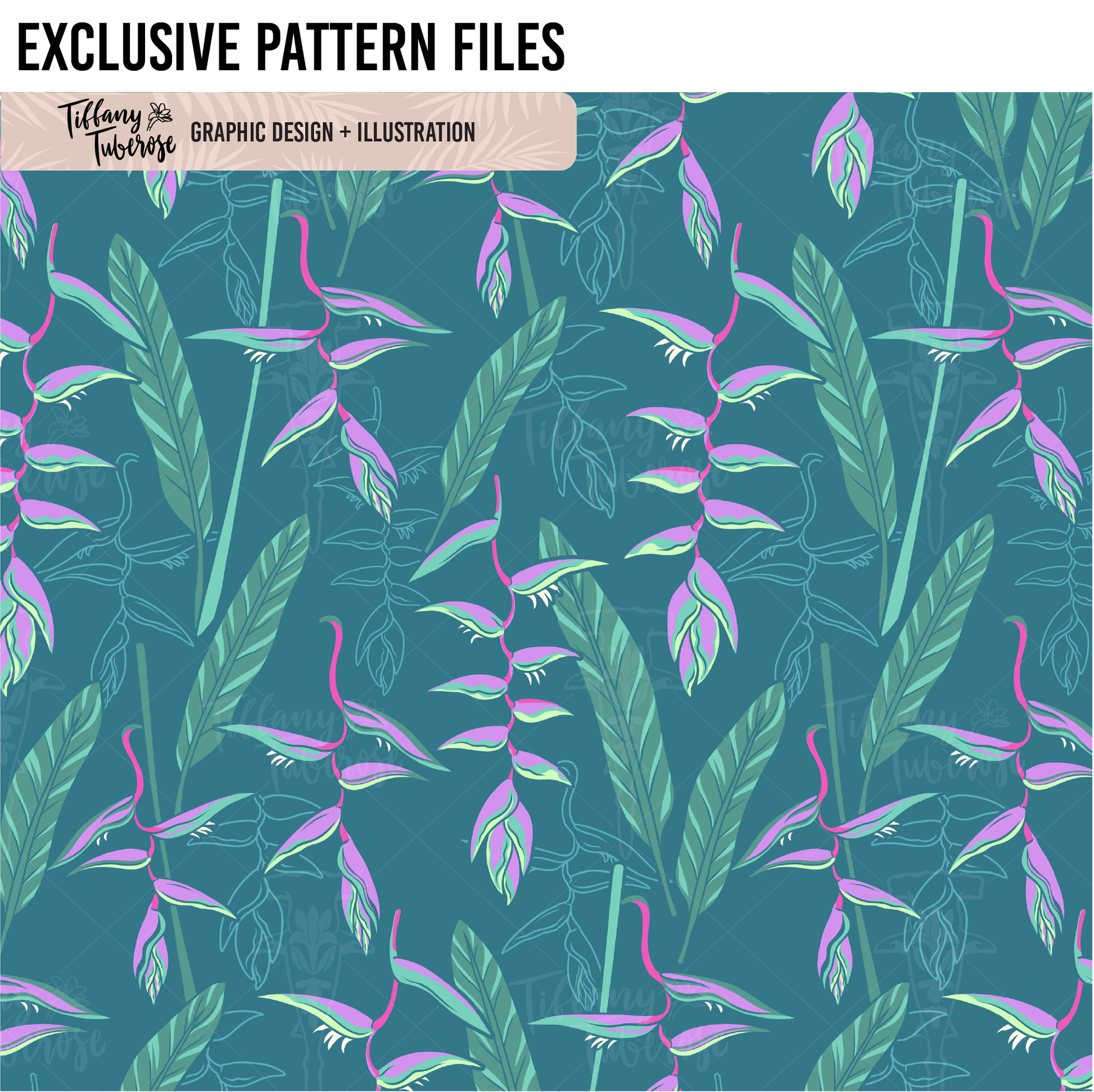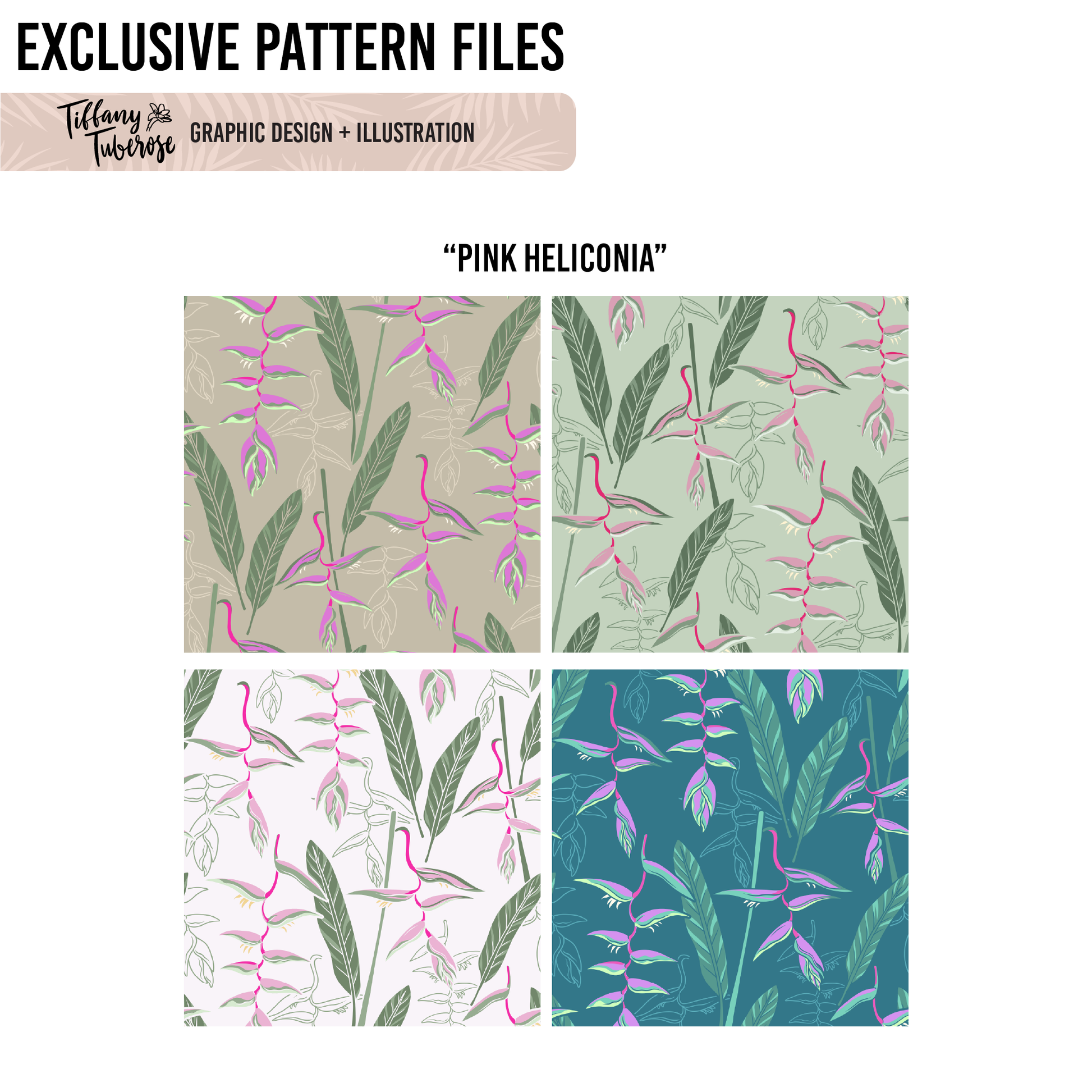 Hand illustrated digital pattern. Pink lobster claw heliconia scattered with leaves in a half-drop repeat and subtle background outlines.